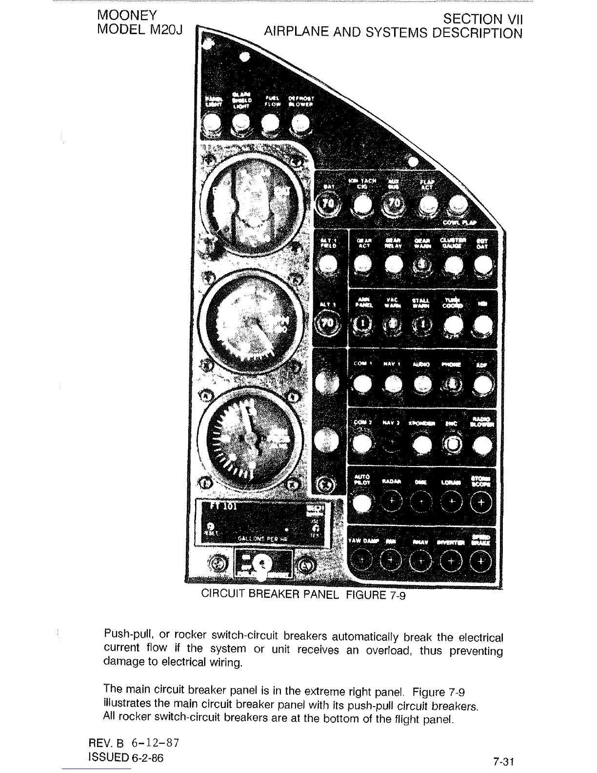 illustrates the main circuit breaker panel with its push-pull circuit breakers.