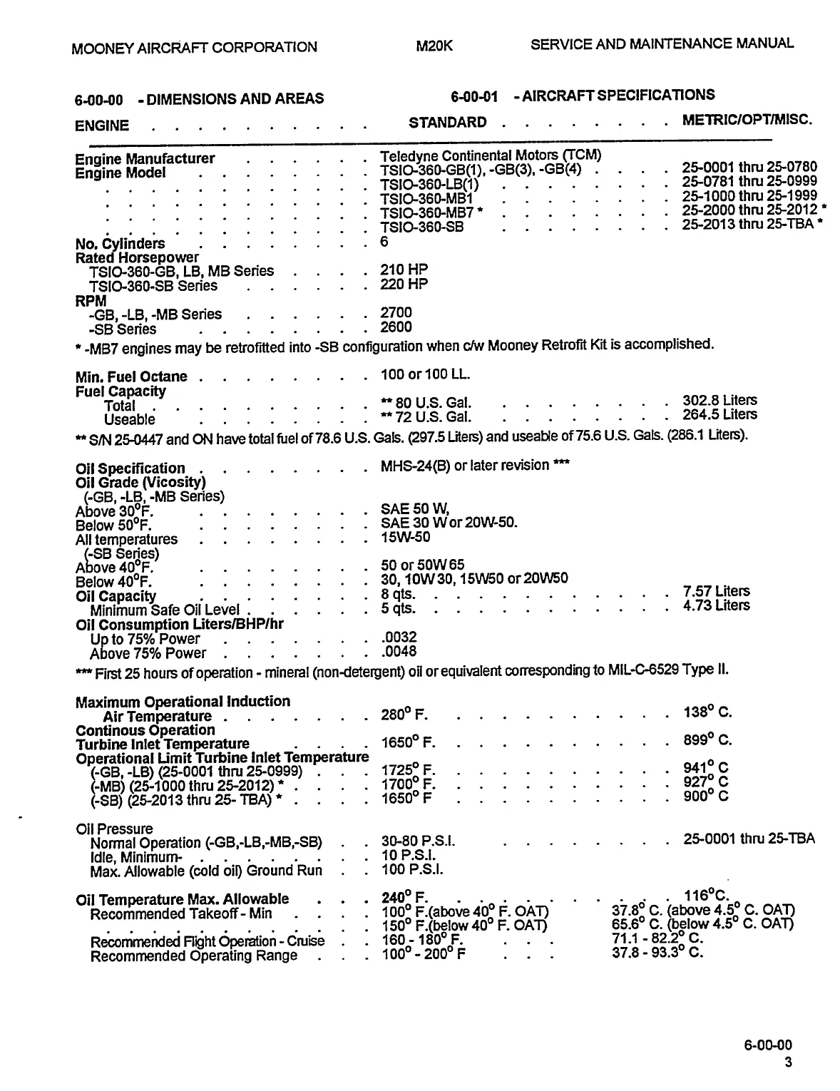 Mooney M20K - Aircraft Specifications