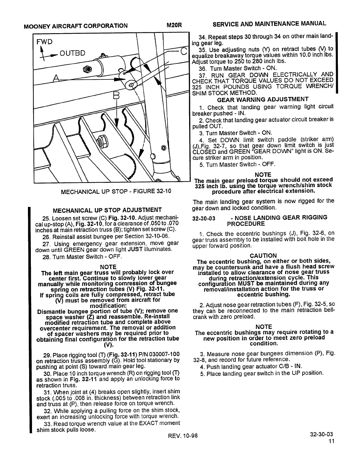 Mooney M20R - Gear Warning Adjustment; Mechanical up Stop Adjustment; Nose Landing Gear Rigging Procedure