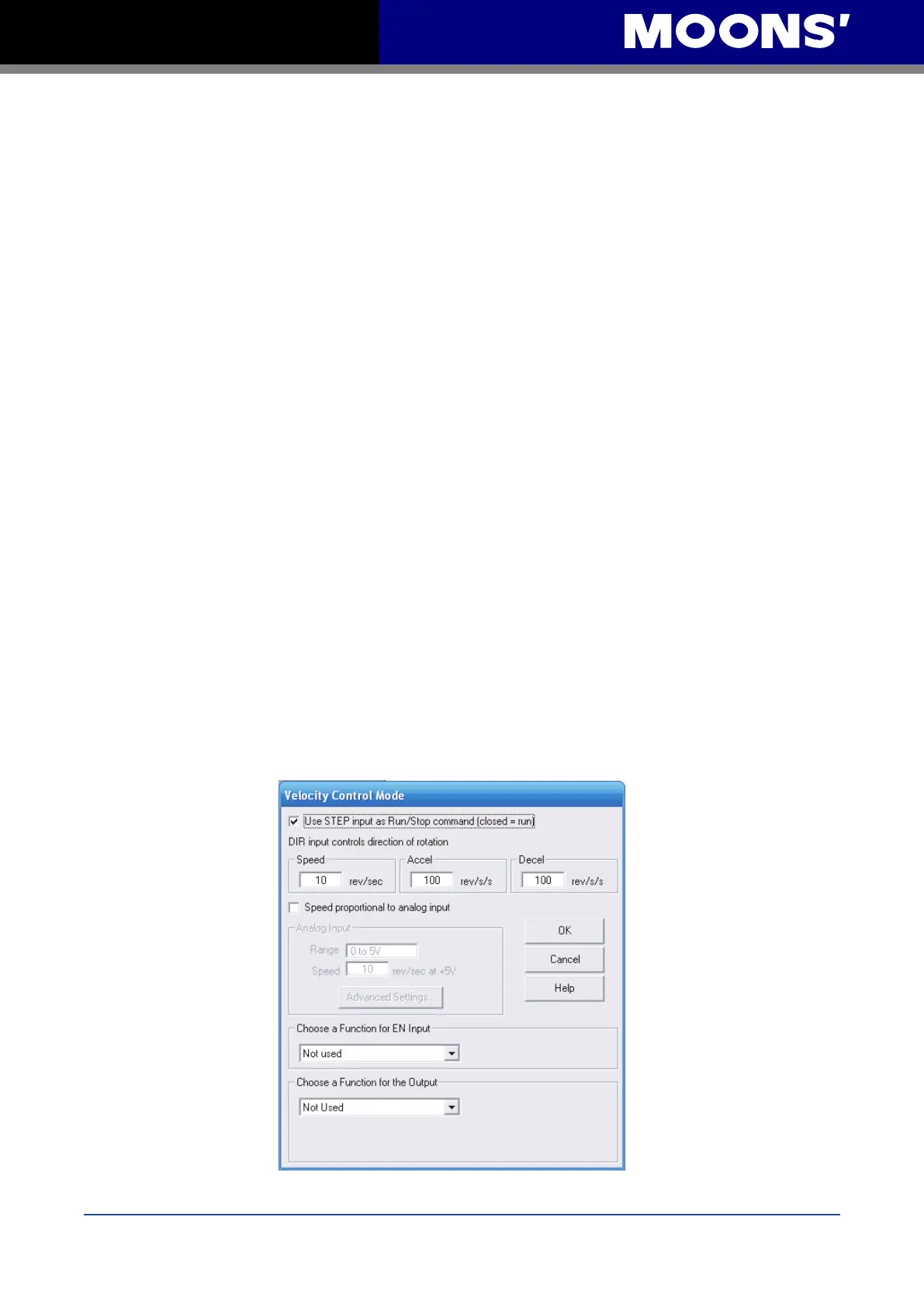 In velocity mode, the motor’s speed is controlled by analog and digital inputs.
