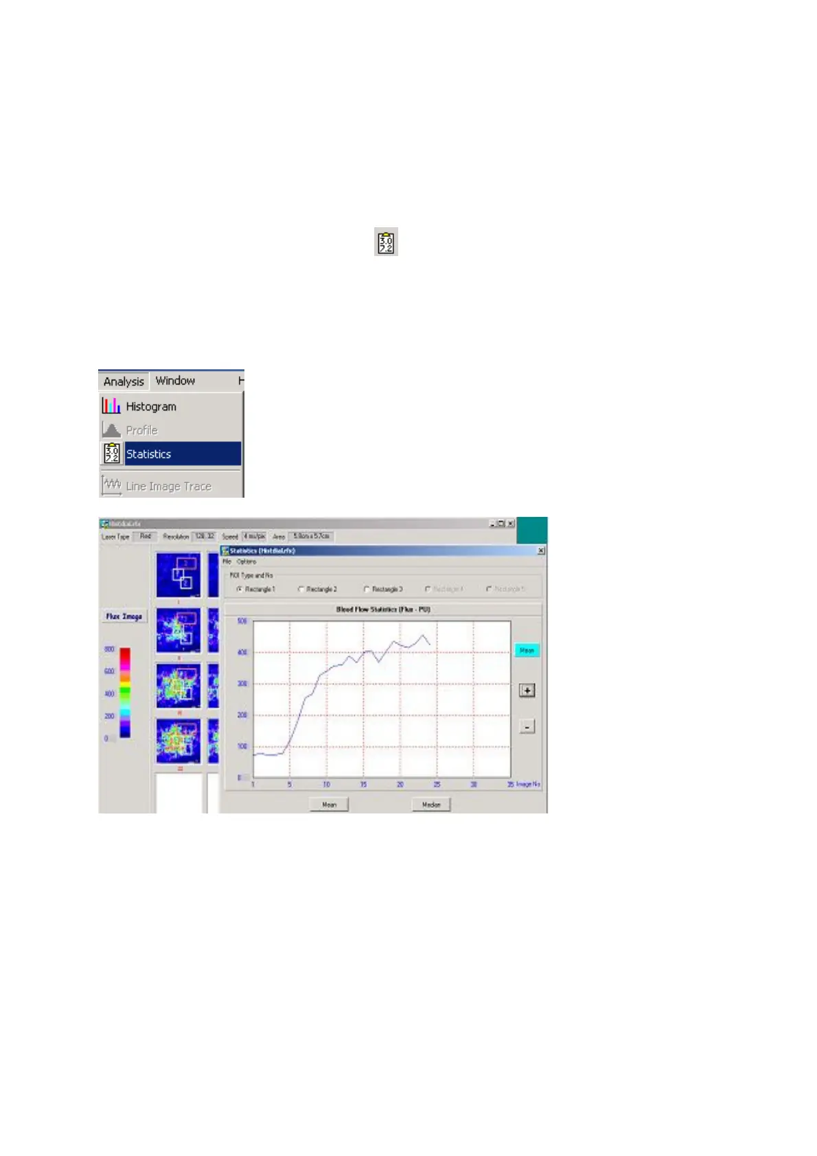 The example below shows a repeat image with 3 ROIs defined. The Statistics window is opened by