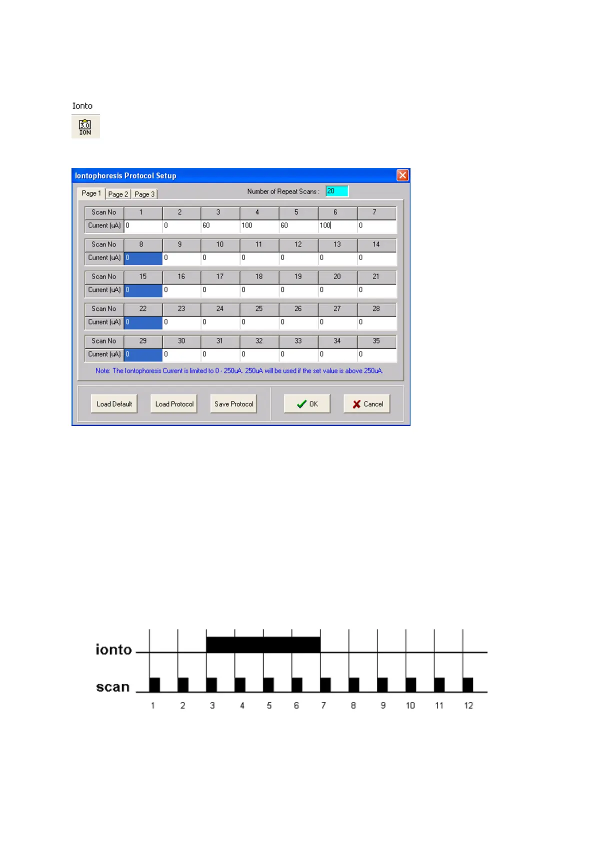Schematic to show the Iontophoresis Current/ Scan interval protocol