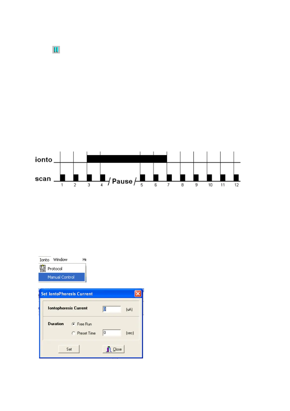 Pause can be used to manually alter the iontophoresis duration and scan interval.