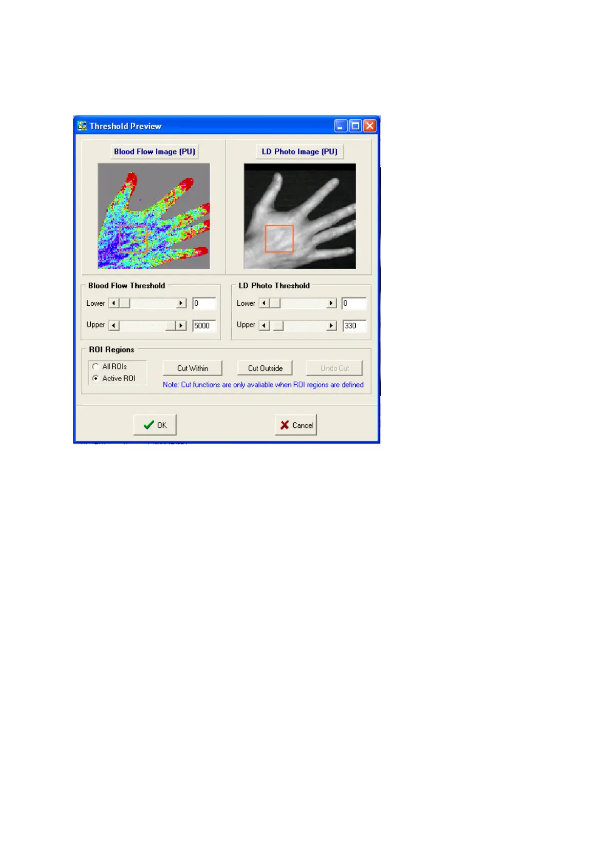 Threshold can be applied to both Blood Flow images and LD Photo images. This can be used to