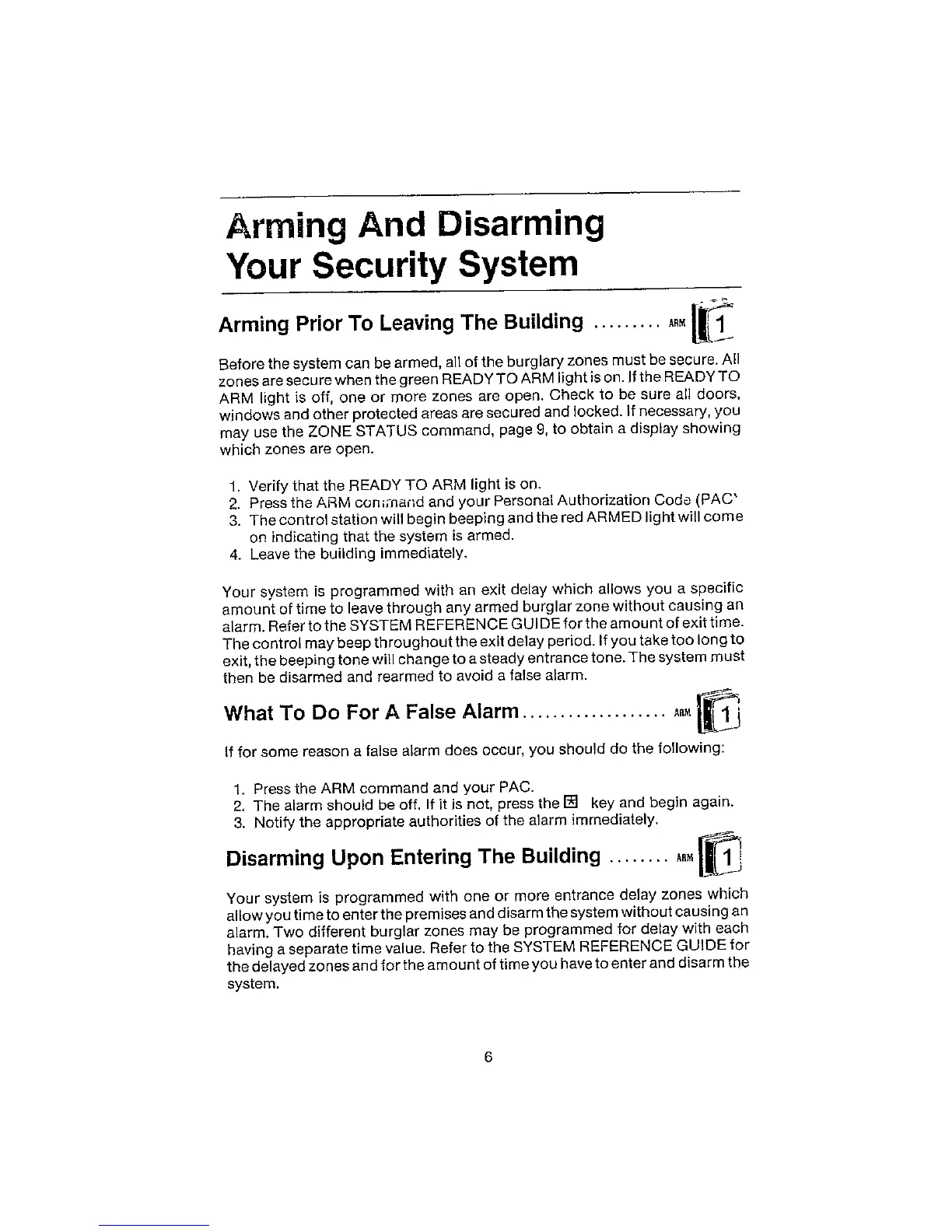 MOOSE System 911 - Arming and Disarming Your System; Arming Prior to Leaving the Building; What to do for a False Alarm; Disarming Upon Entering the Building