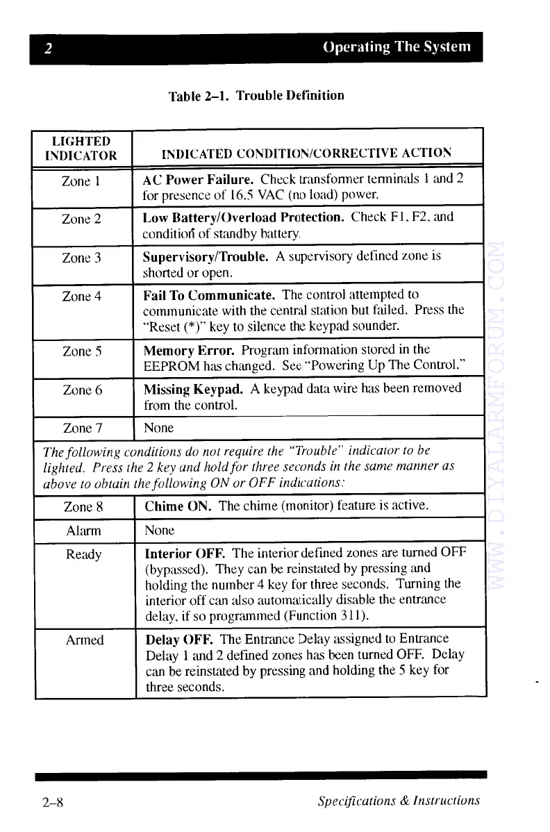 MOOSE Z800 - Operating The System; Trouble Definition Table