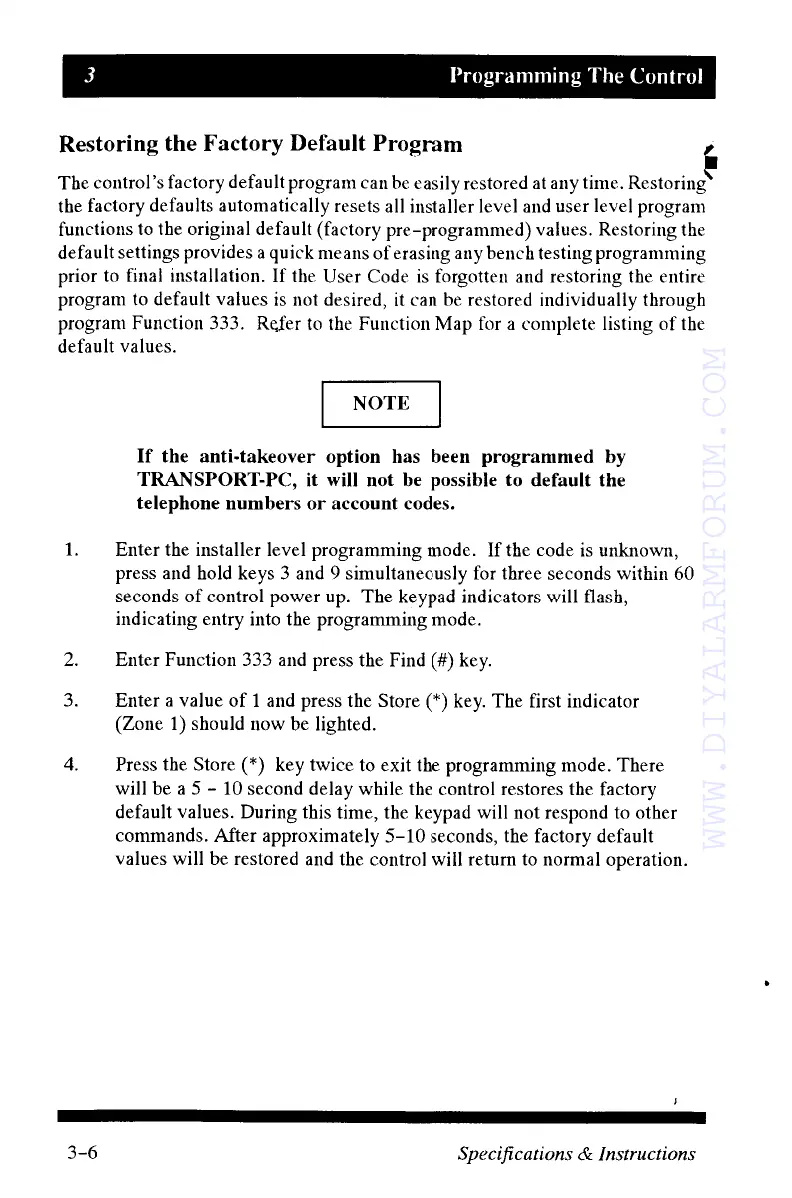 MOOSE Z800 - Programming The Control; Restoring Factory Default Program Settings