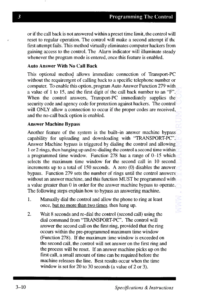 MOOSE Z800 - Programming The Control; Auto Answer Without Call Back; Answer Machine Bypass Procedure