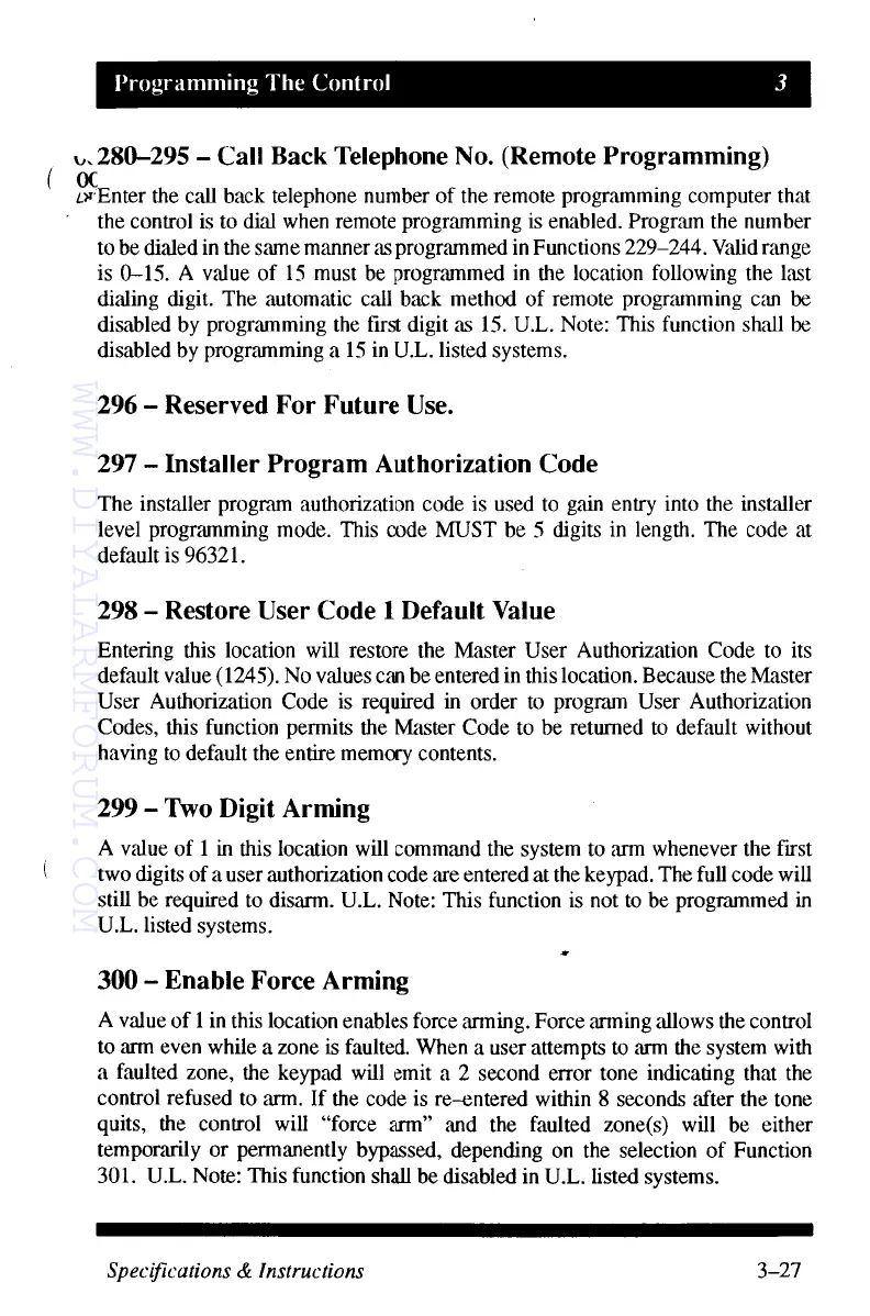 MOOSE Z800 - Programming The Control; Call Back Telephone Number for Remote Programming; Installer Authorization Code and User Code Restoration; Two Digit Arming and Force Arming Options