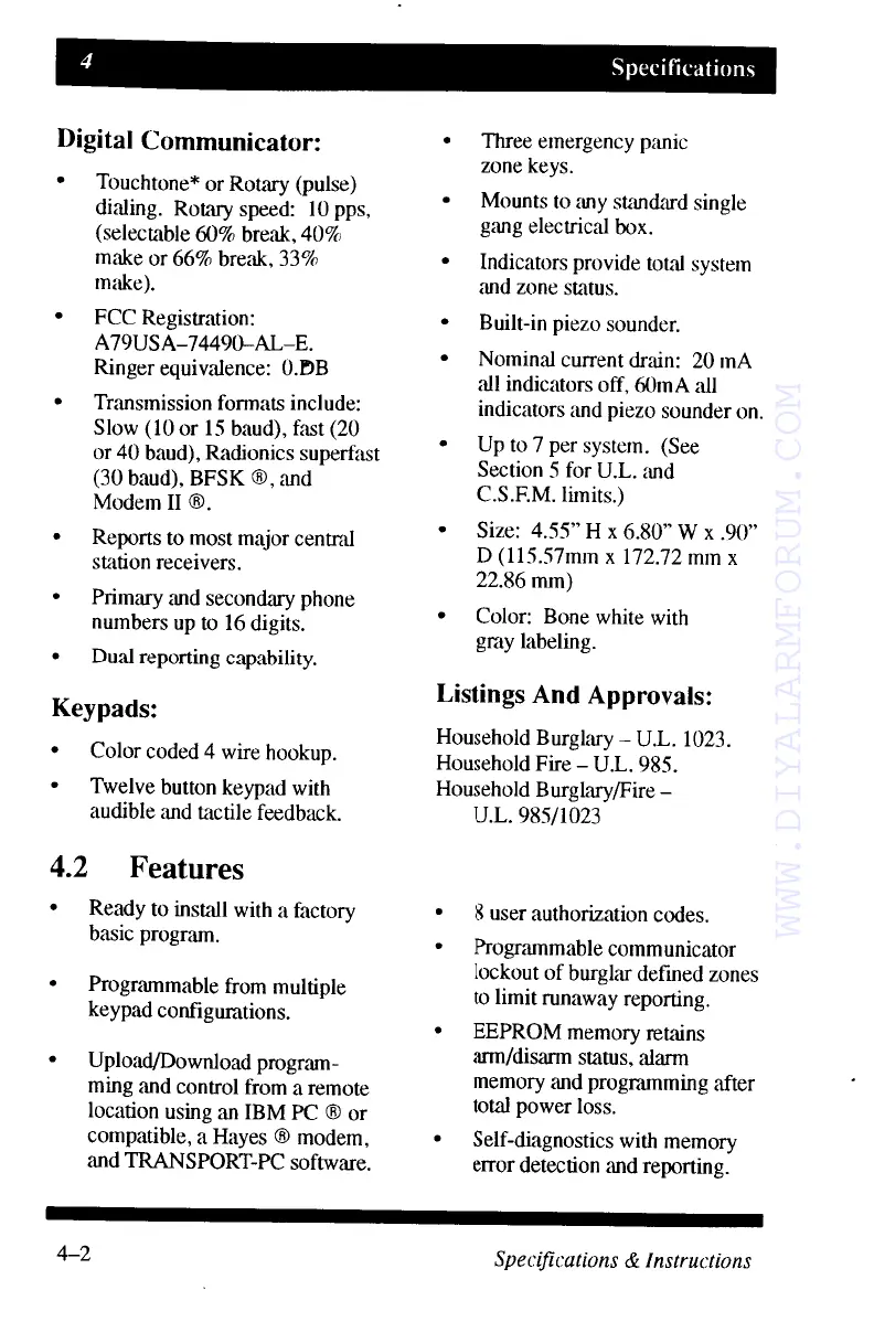 MOOSE Z800 - Specifications; Digital Communicator and Keypad Specifications; System Features and Approvals