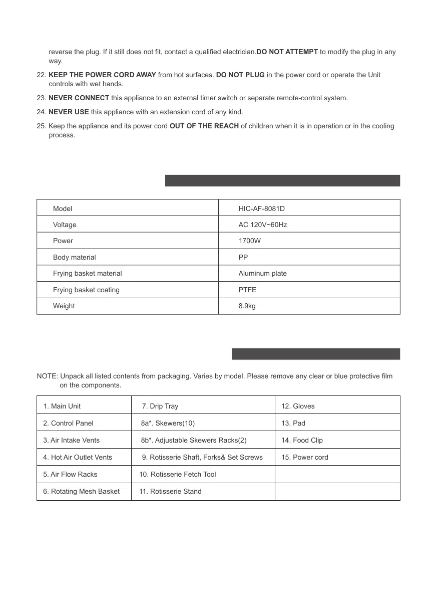 22. KEEP THE POWER CORD AWAY from hot surfaces. DO NOT PLUG in the power cord or operate the Unit