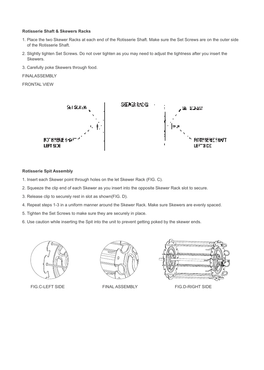 1. Place the two Skewer Racks at each end of the Rotisserie Shaft. Make sure the Set Screws are on the outer side