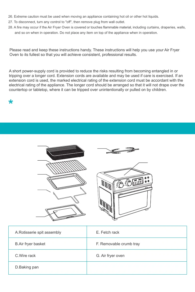 28. A fire may occur if the Air Fryer Oven is covered or touches flammable material, including curtains, draperies, walls,