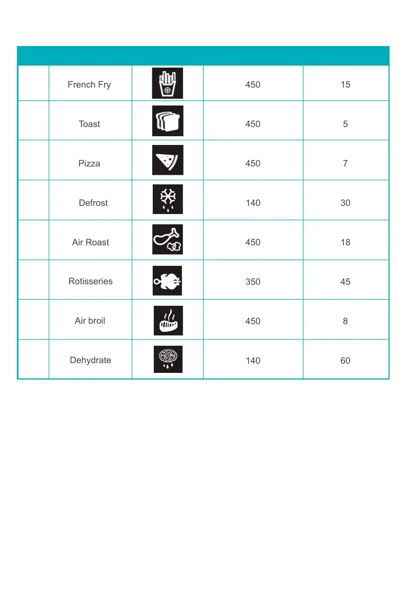 Moosoo MA90 - French Fry Cooking Function; Toast Cooking Function; Pizza Cooking Function; Defrost Function Details