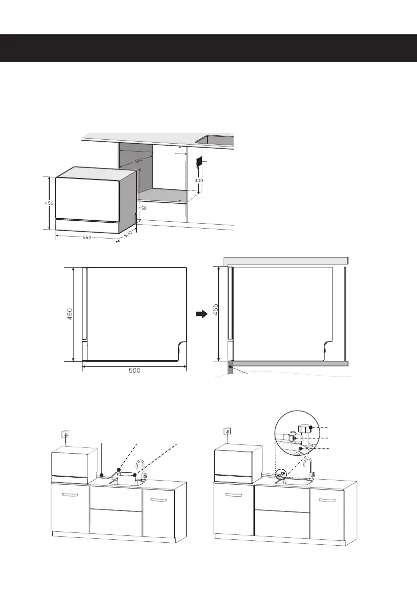 1. The dishwasher can be placed on a flat table or insert into a cabinet