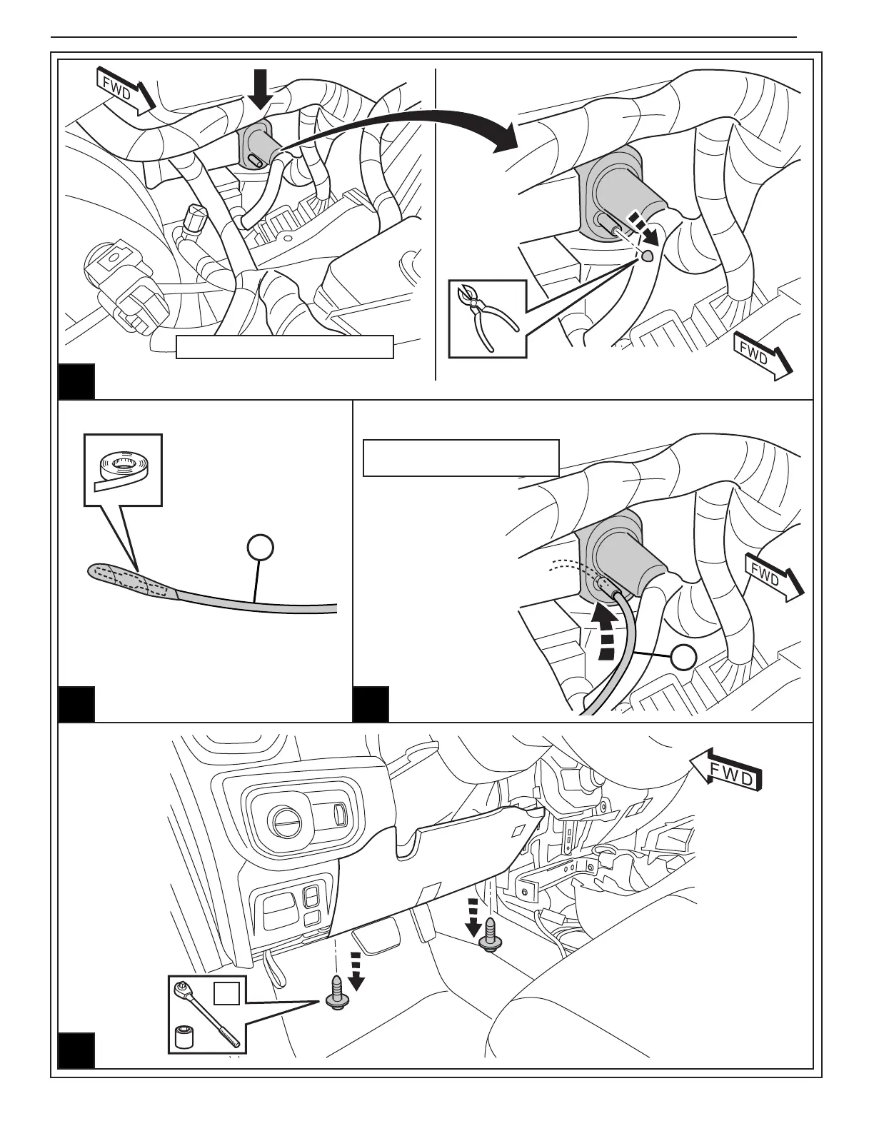 Alimenter soigneusement le faisceau de câbles (B) à travers l'œillet en caoutchouc