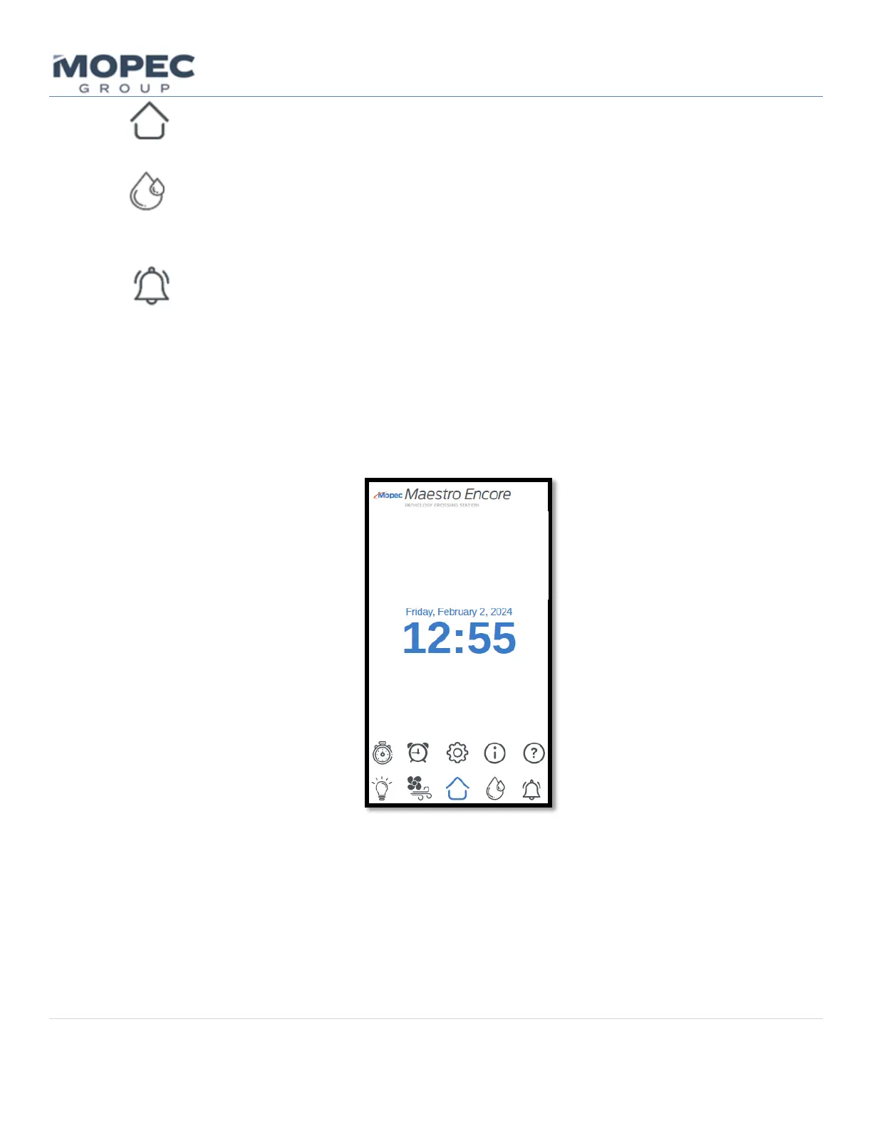 • With the unit turned ON the main home page will show. The main page has icon buttons below for Overhead