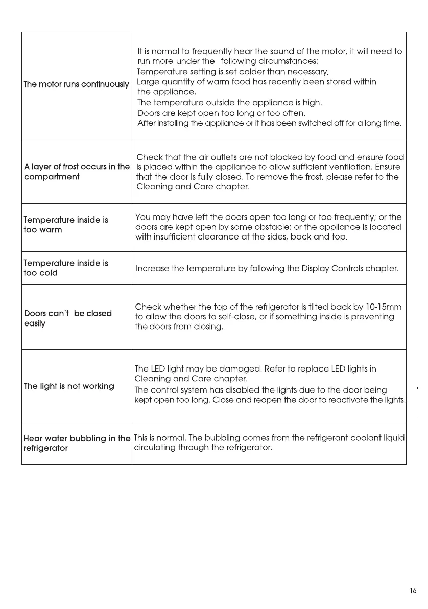 Mora MRT180N6AWD - Noise Issues and Motor Operation; Temperature, Frost, and Door Problems