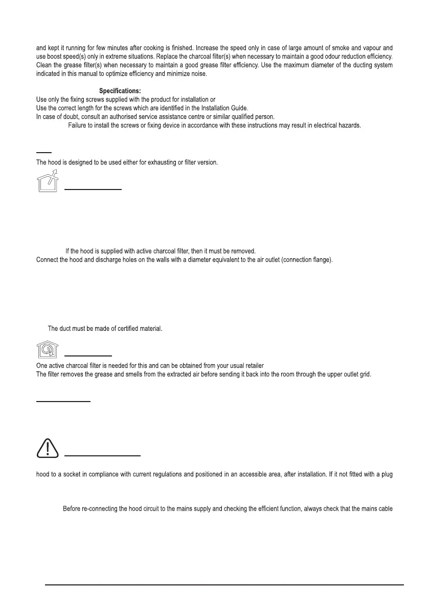 The mains power supply must correspond to the rating indicated on the plate situated inside the hood. If provided with a plug connect the