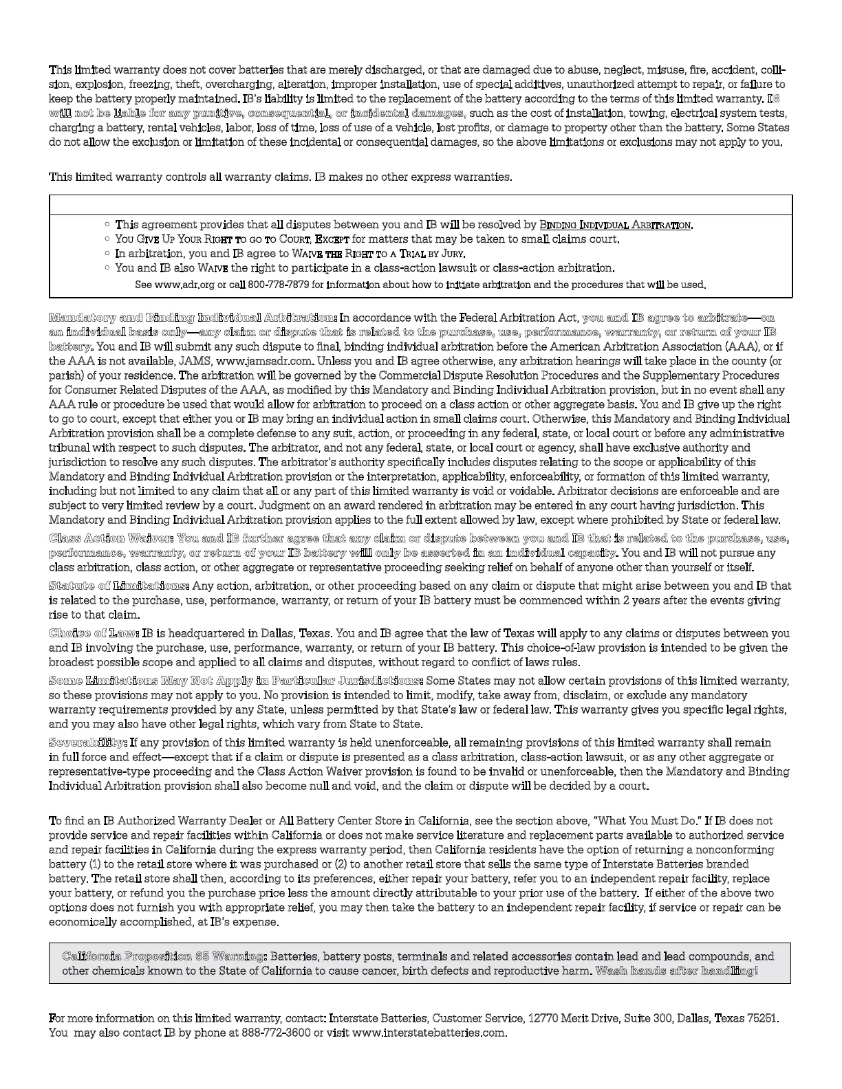 performance, warranty, or return of your IB battery will only be asserted in an individual capacity. You and IB will not pursue any