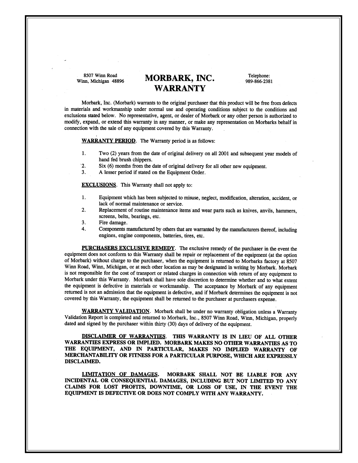 Morbark 2060-D CYCLONE - Warranty
