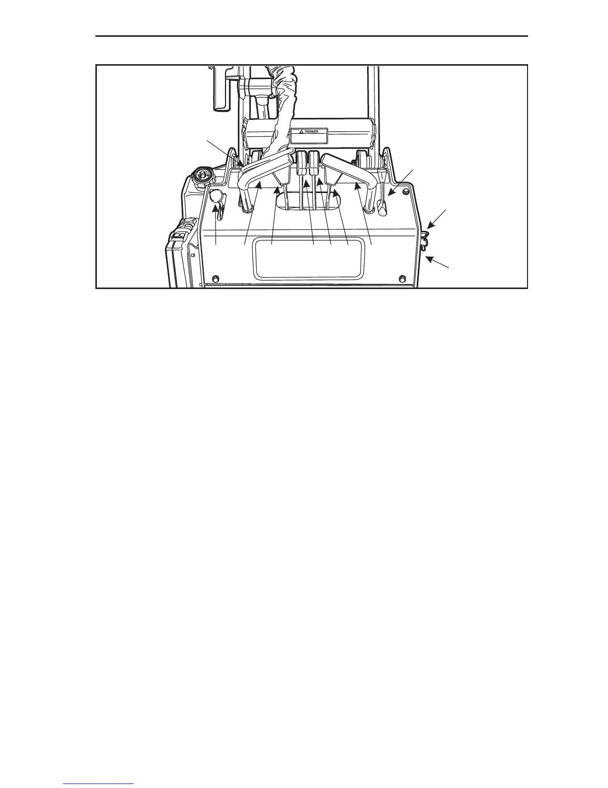7. Left Travel Motor Control – Pushing the lever forward rotates the left side wheels for