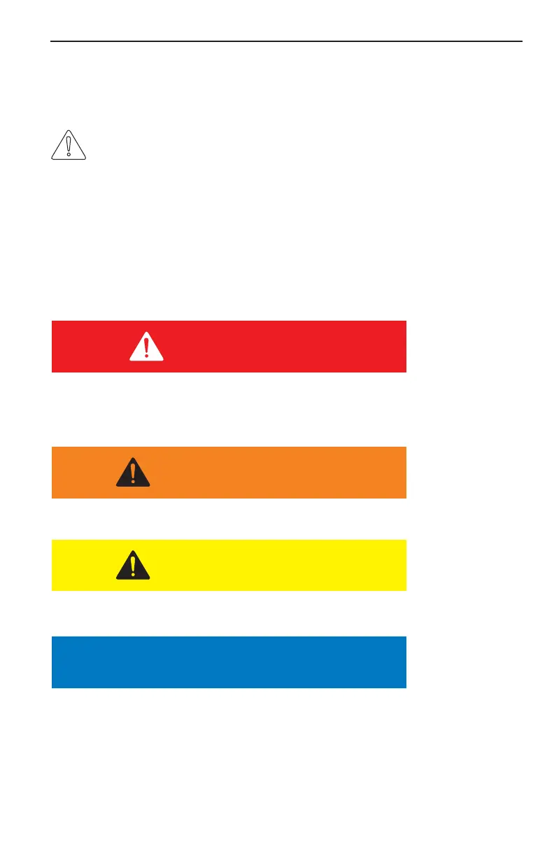 The words “DANGER”, “WARNING”, and “CAUTION” are used throughout this manual