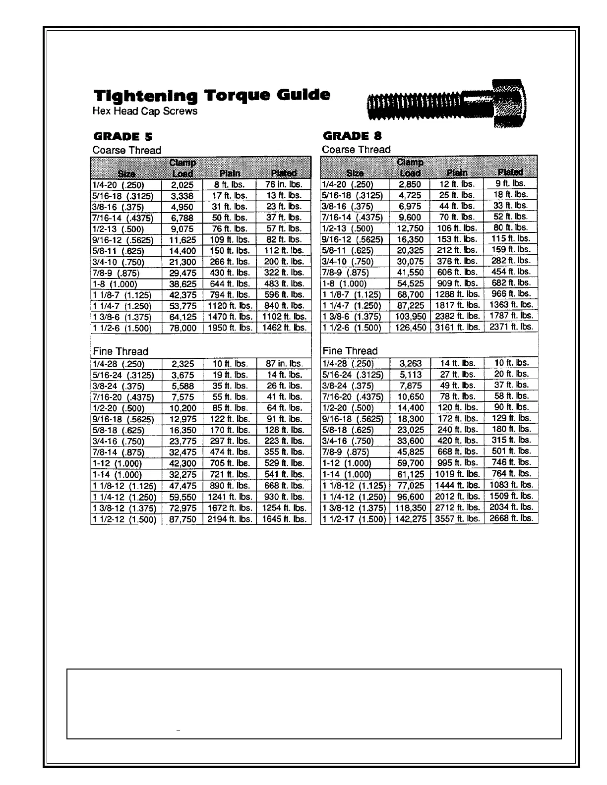**Based on IFI 5th Edition Technical Data N-12/N-16, using Equation (1) and a torque coefficient, K=0.20 for nonplated steel fasteners and K=0.15 for plated fasteners.