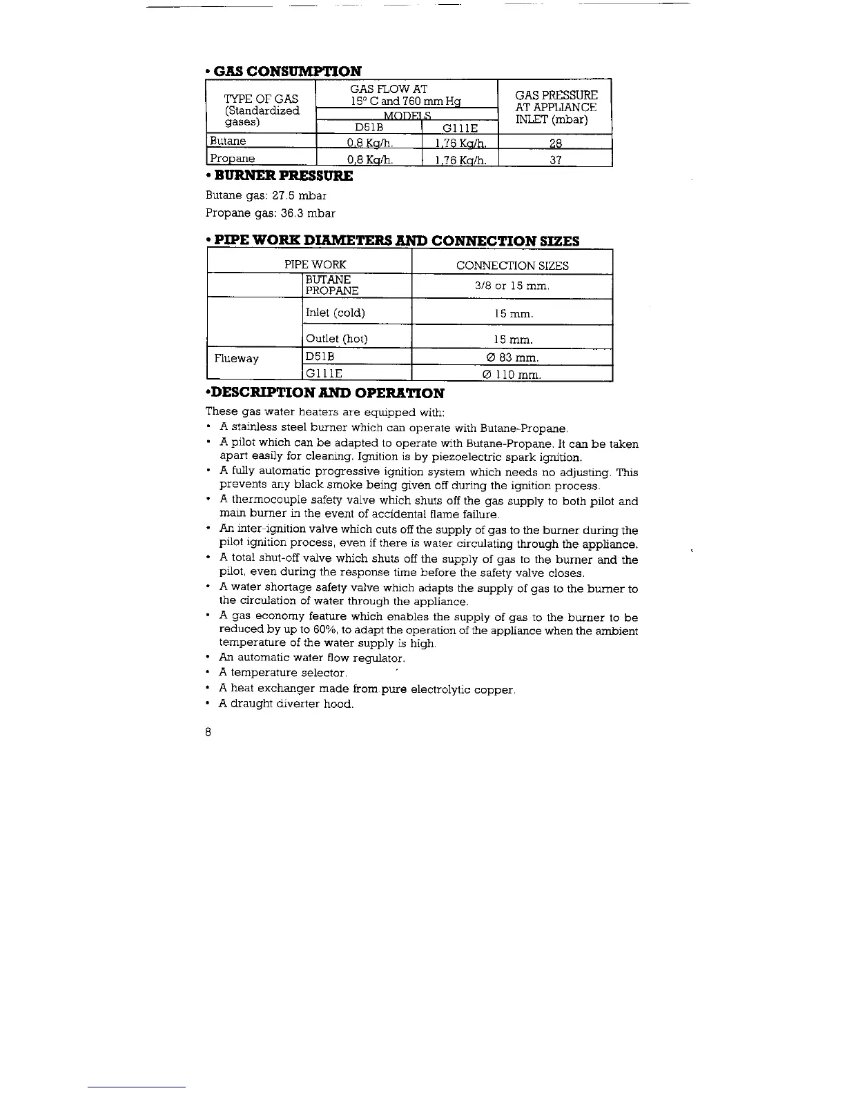 Morco D-51B - Gas Consumption; Burner Pressure; Pipe Work Diameters and Consumption Sizes