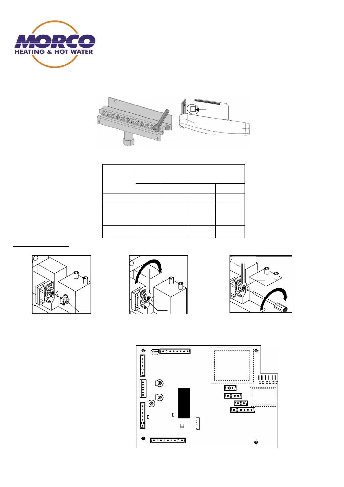 Morco FEB-24E - Gas Valve Details and Adjustments; Burner Pressure Chart and Gas Valve Figures; PCB Adjustment Points (P1, P2, P3)