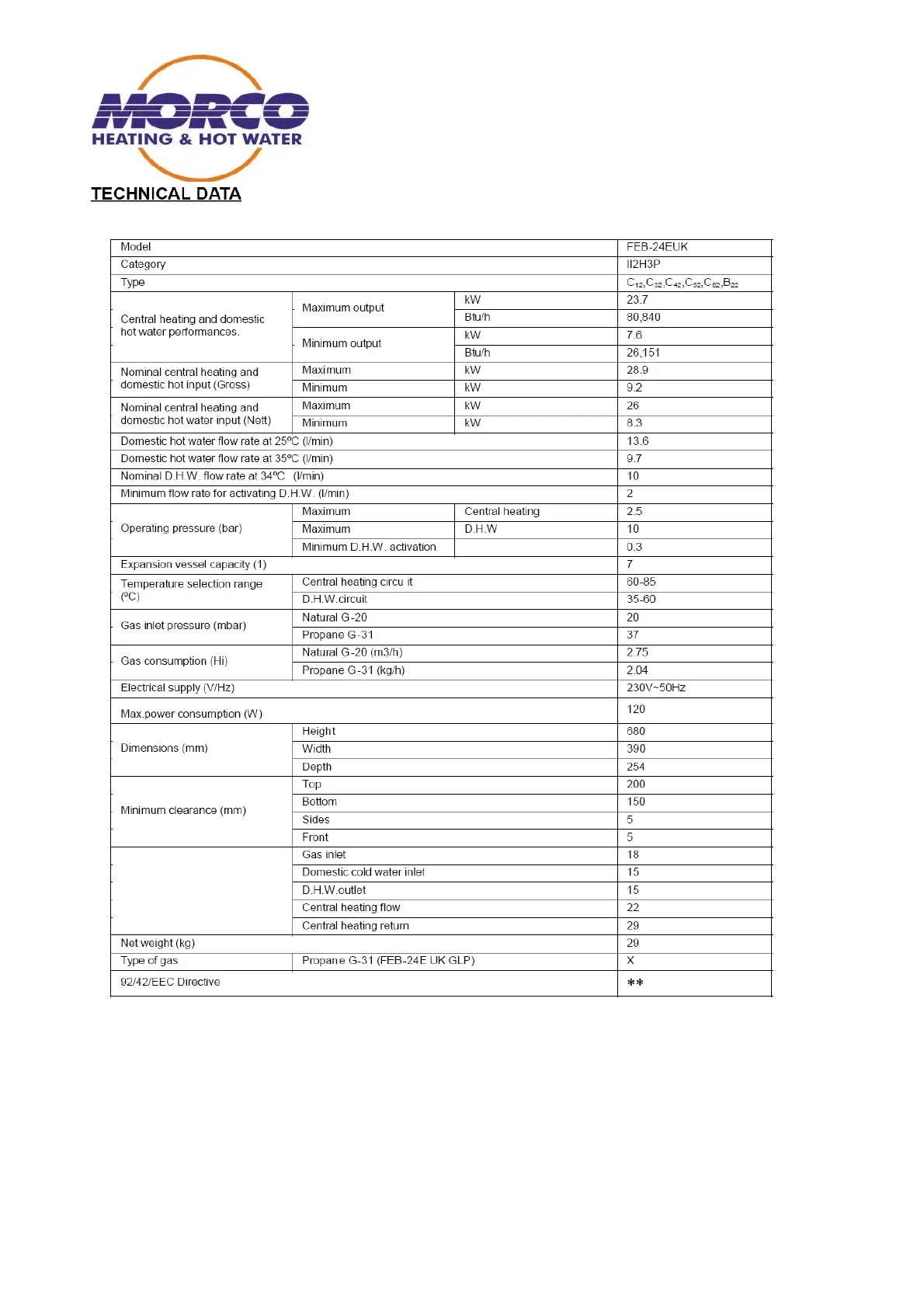 Morco FEB-24E - Technical Data; Boiler Model and Performance Data; Input, Flow Rates, and Pressure Data; Dimensions, Clearances, and Gas Data