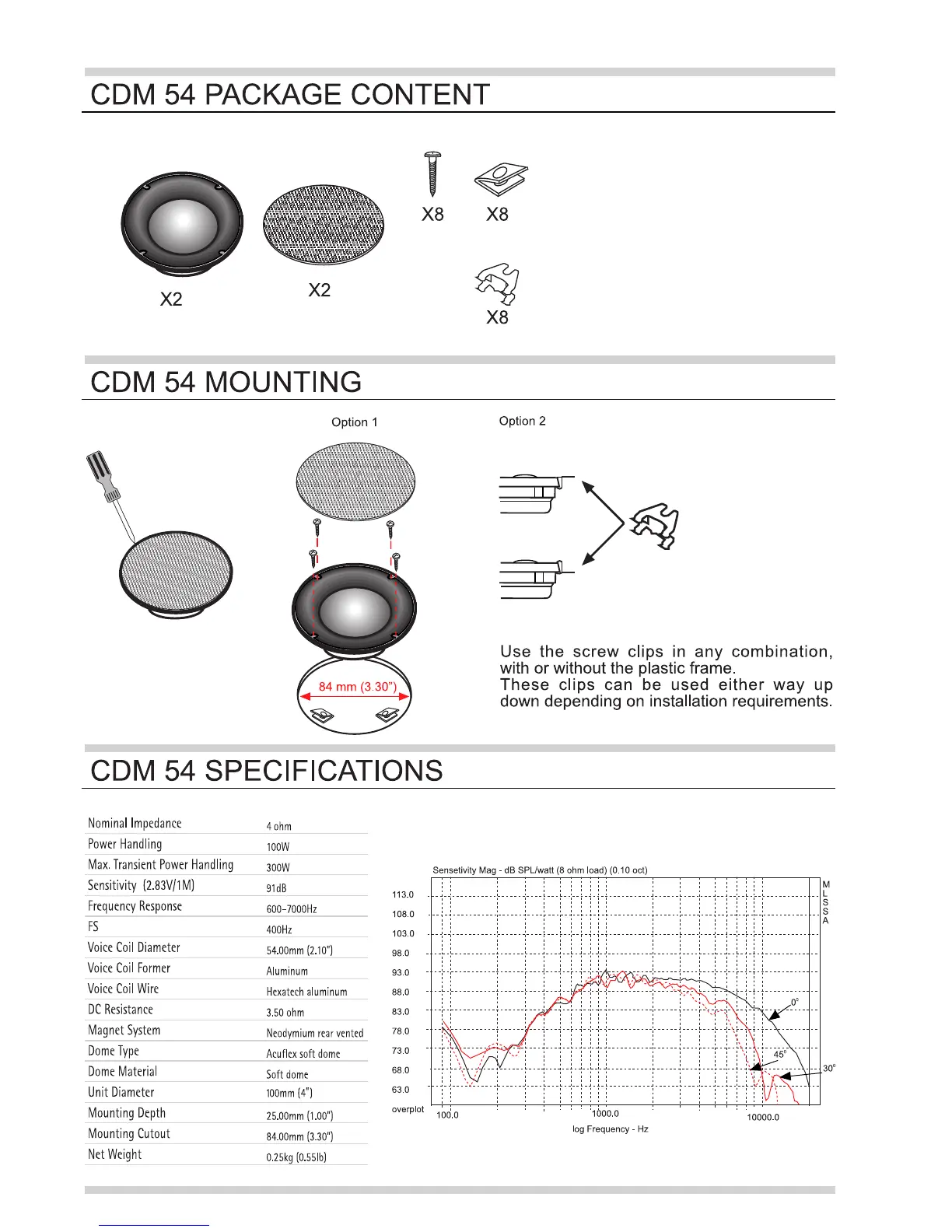 Morel CDM-54 - CDM 54 Package Contents; CDM 54 Mounting; Mounting Clips Usage; CDM 54 Specifications