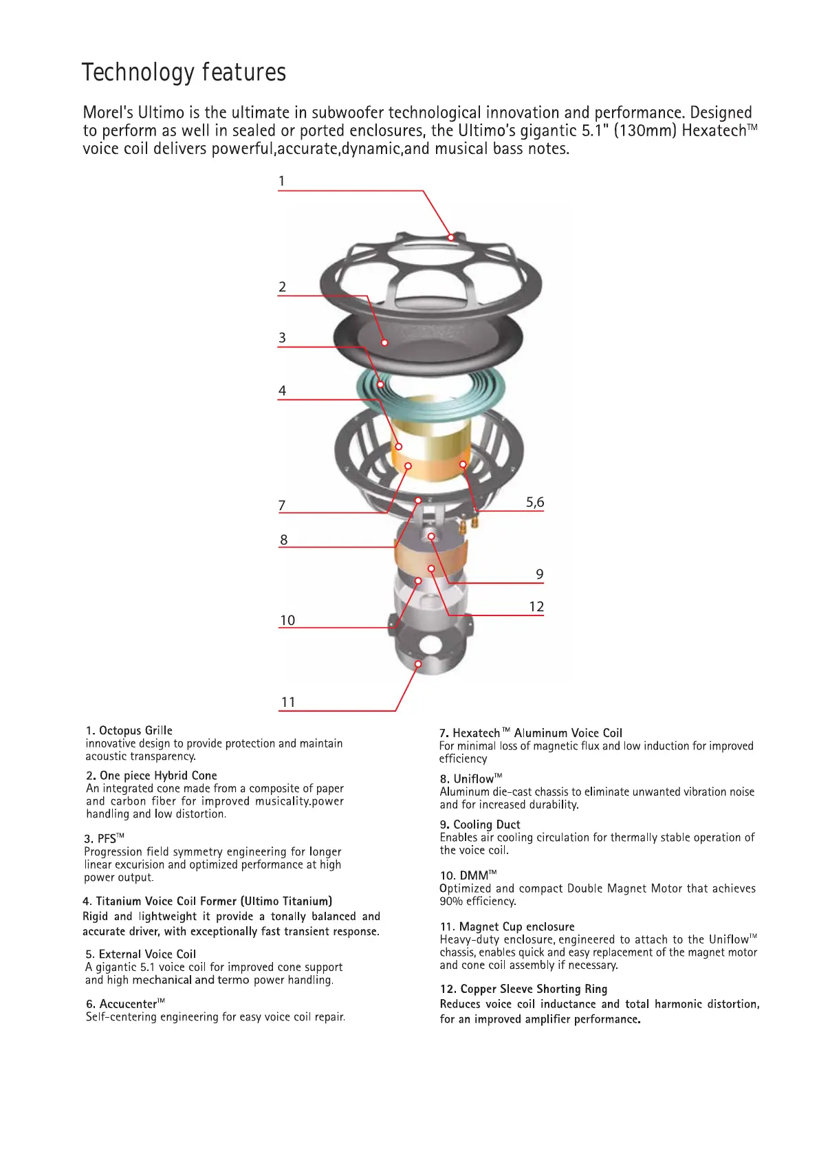 Morel ULTIMO Series - Ultimo Subwoofer Technology Features; Octopus Grille; One Piece Hybrid Cone; PFS Technology