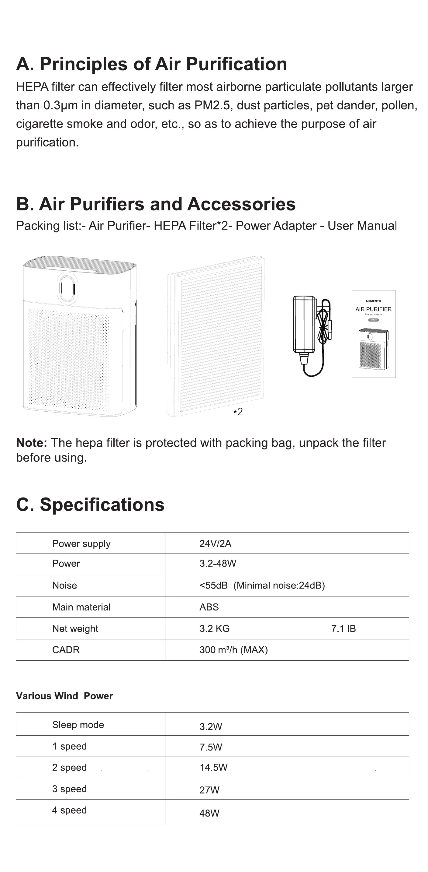 Packing list:- Air Purifier- HEPA Filter*2- Power Adapter - User Manual