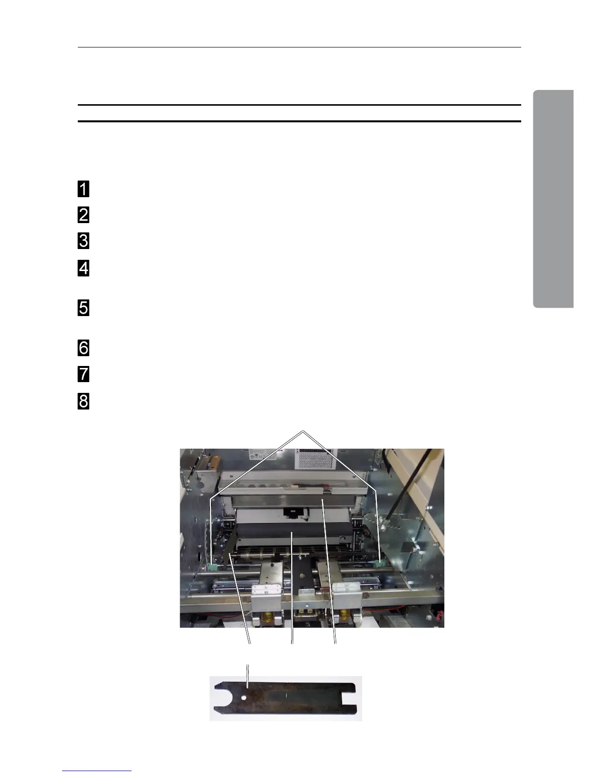 Lift up the guide (B) from below the upper fold roller (C).