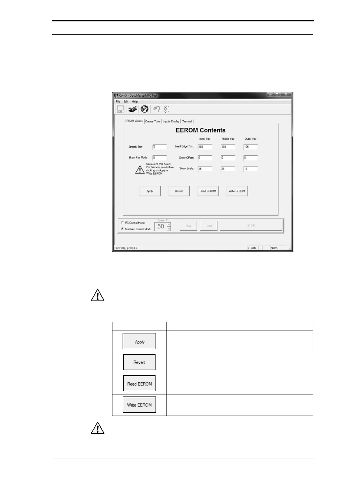 the EEROM Contents page. Always use the Machine Calibration Wizard to update the