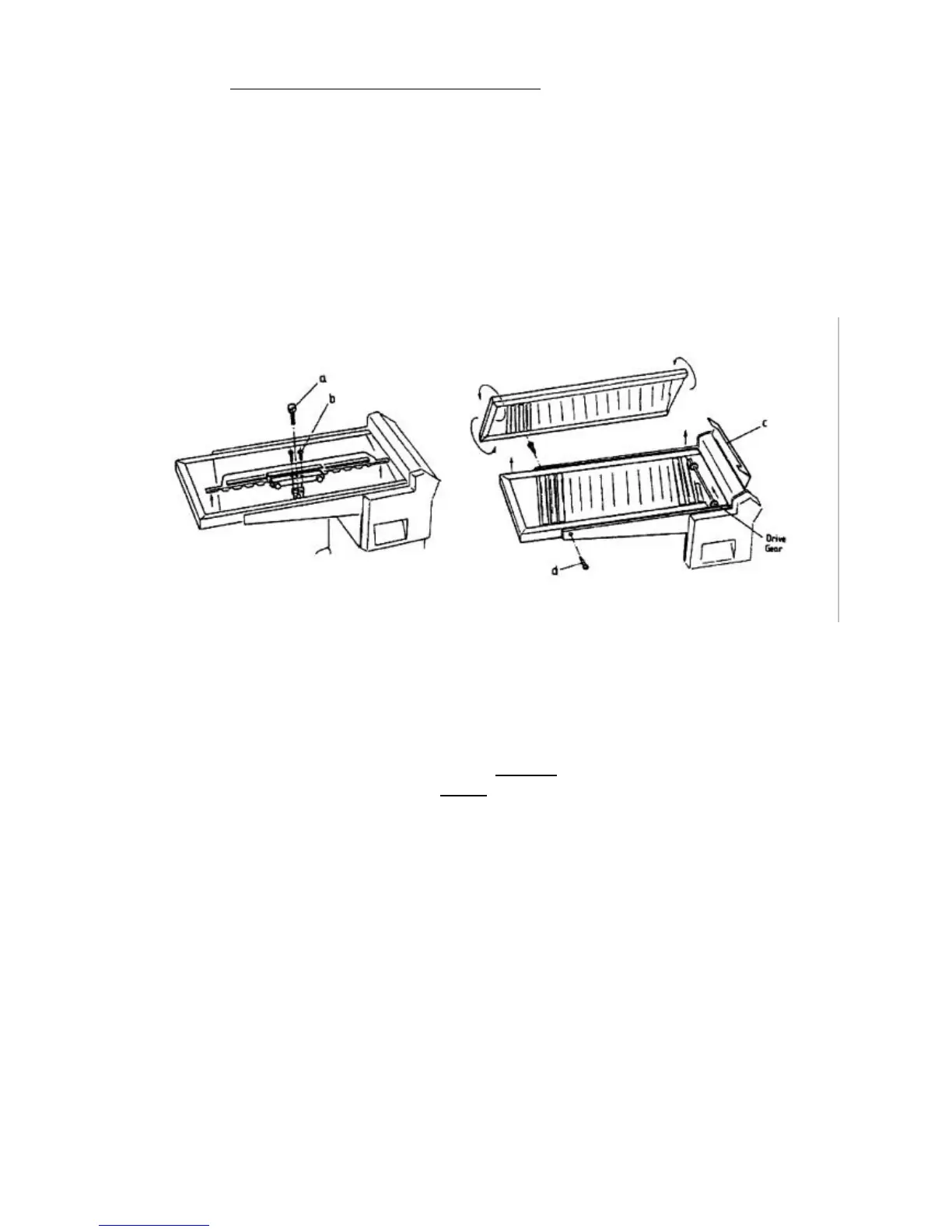 3. Drop the roller bed off its prop and remove the shoulder screws (d). Lift