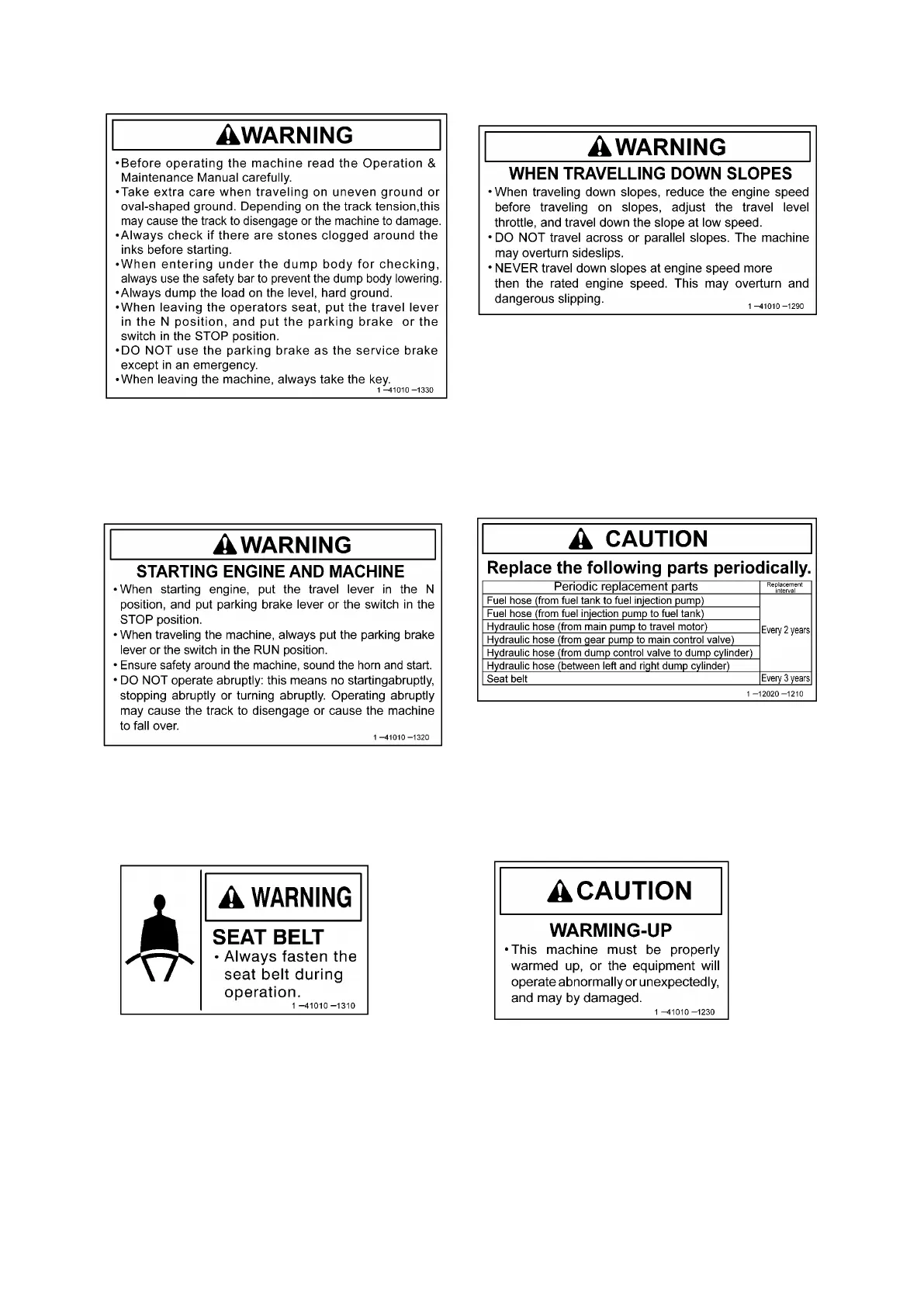 (1) Precautions when operation (1-41010-1330) (2) machine Precautions when travelling downhill