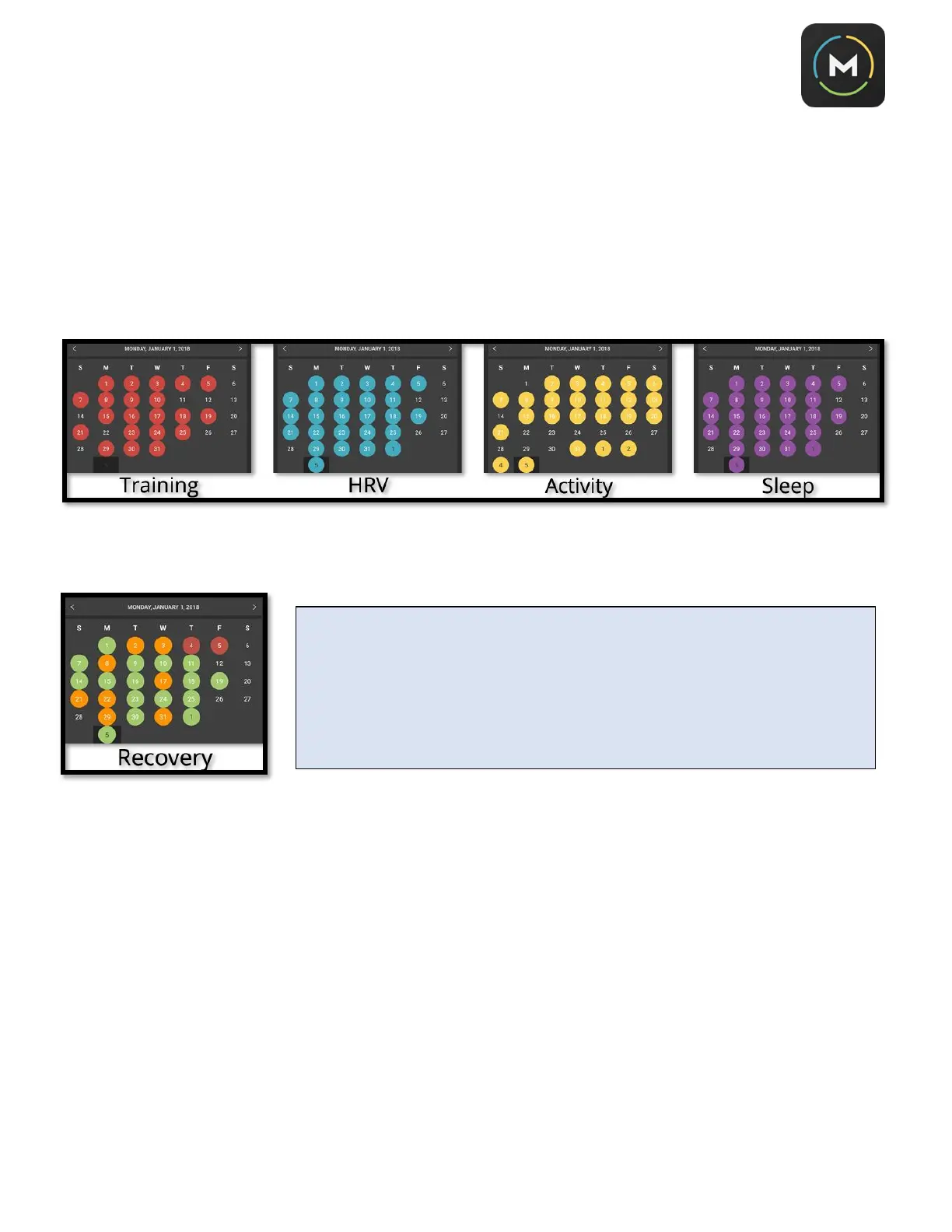 Recovery data will appear as either green, amber, or red, depending on your recovery score each day: