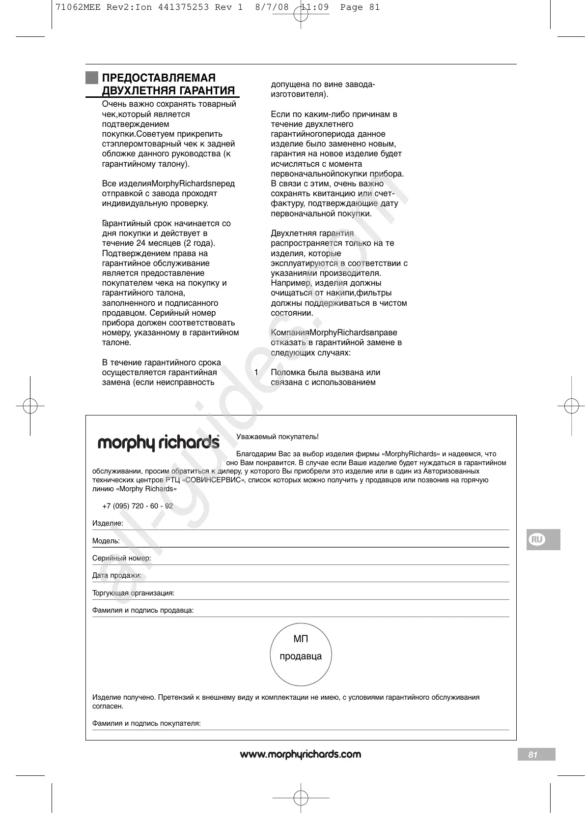 Благодарим Вас за выбор изделия фирмы «MorphyRichards» и надеемся, что
