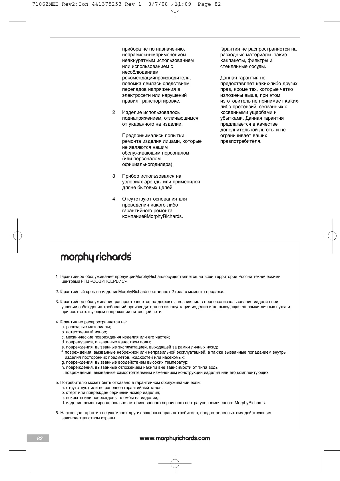 d. изделие ремонтировалось вне авторизованного сервисного центра уполномоченного MorphyRichards.