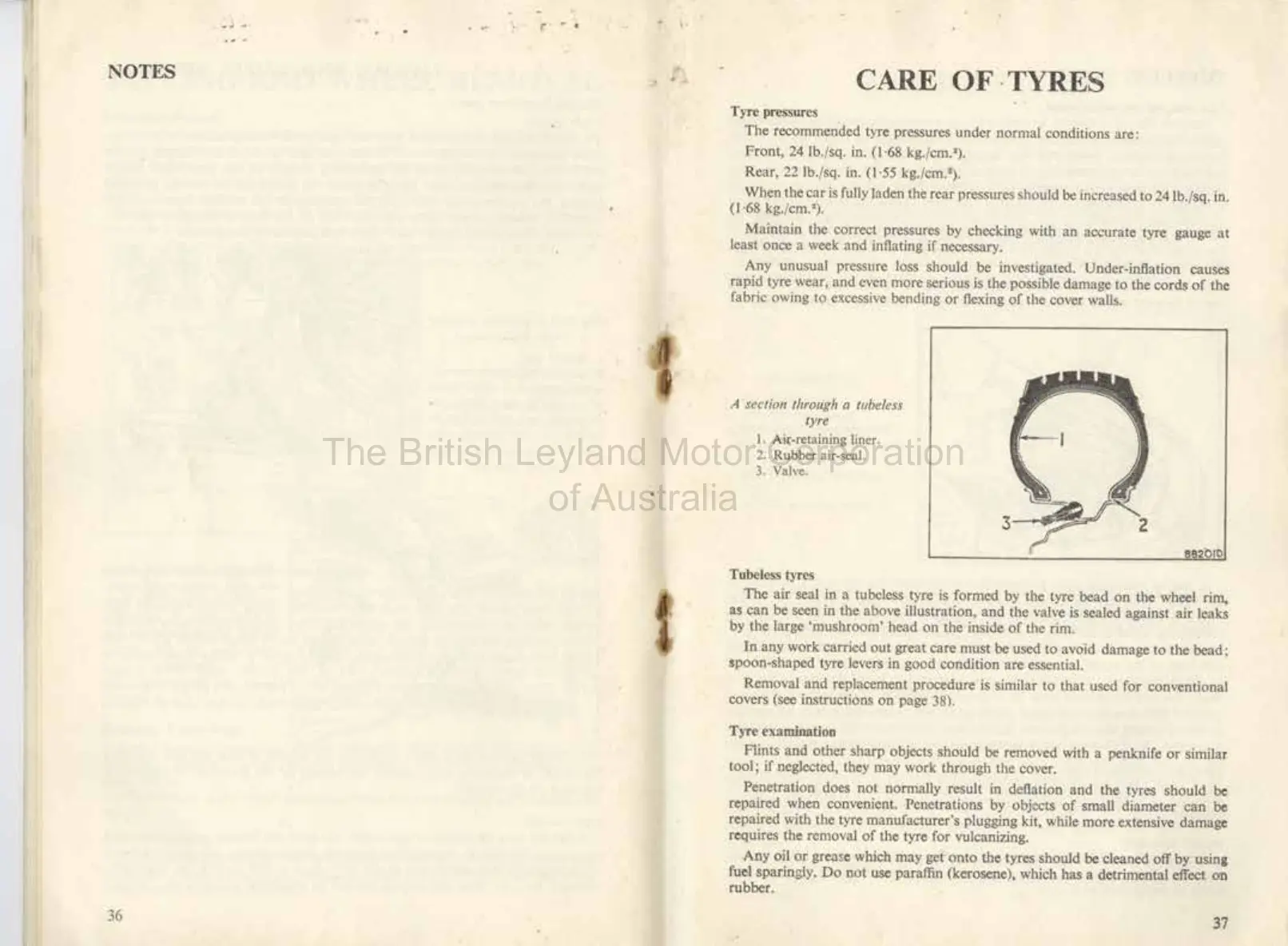 Morris MINI-MINOR - CARE OF TYRES; Tyre Pressures and Maintenance; Tubeless Tyre Servicing and Examination
