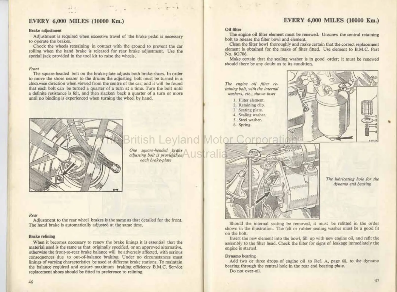 Morris MINI-MINOR - MAINTENANCE ATTENTION (Continued); 6,000 Miles Service - Brakes and Oil Filter; Dynamo Bearing Lubrication