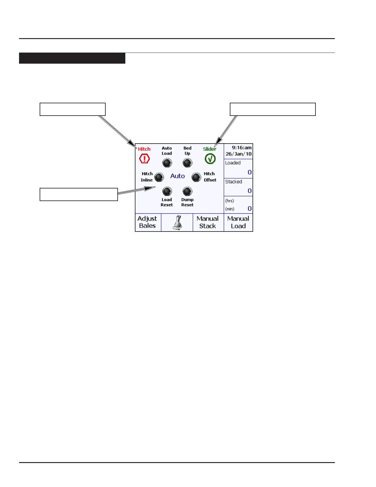 • Raise the loader using the Loader Up button on the joystick.