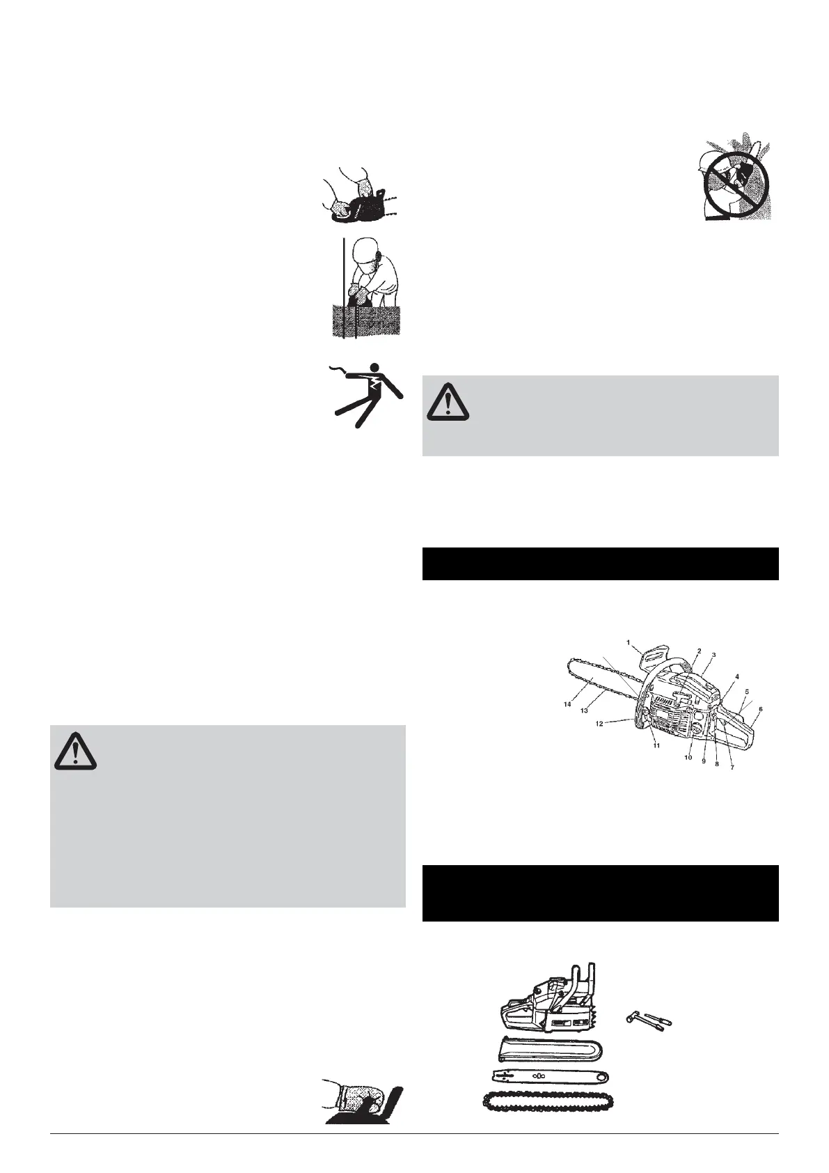 • Parts of the chainsaw get very hot. Do not sit the chain-