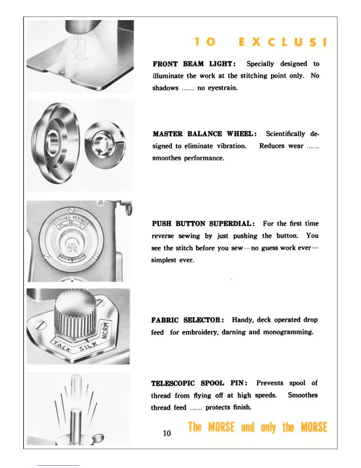 morse Super Dial - Front Beam Light; Master Balance Wheel; Push Button Superdial; Fabric Selector, Telescopic Spool Pin