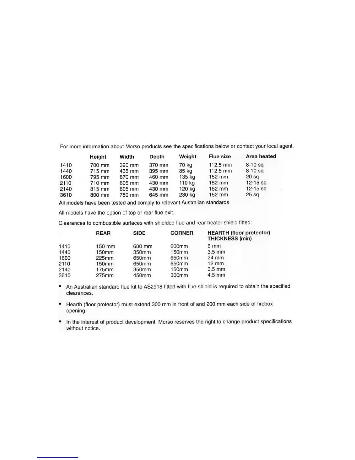 Morso 1600 - Installation Clearances as Tested to AS2918:1999; Clearances to Combustible Surfaces with Shielded Flue and Rear Heater Shield Fitted; Hearth (Floor Protector) Thickness (Min)