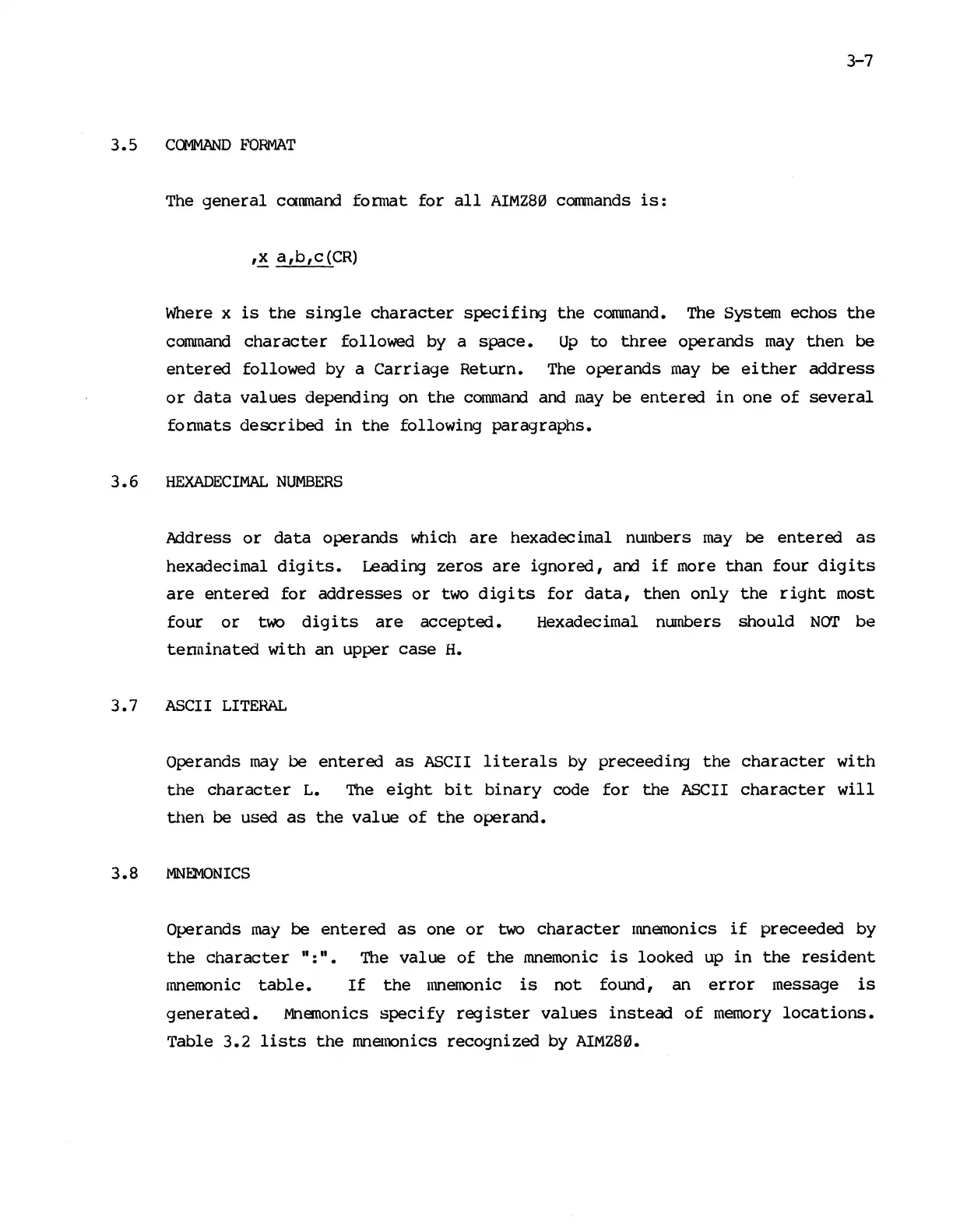 Mostek z80 - Command Syntax Format; Hexadecimal Number Input; ASCII Literal Operand Input; Mnemonic Operand Usage