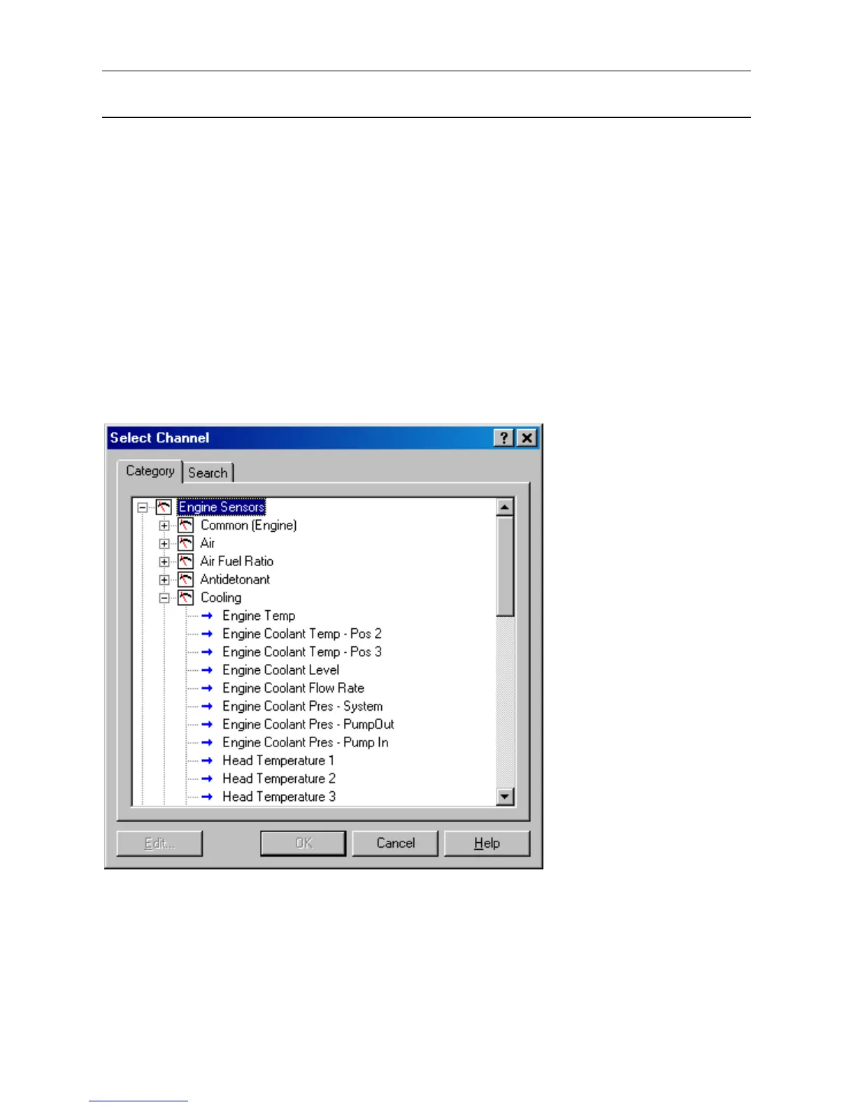the ‘Engine Sensors / Cooling’ category shows a list of channels associated