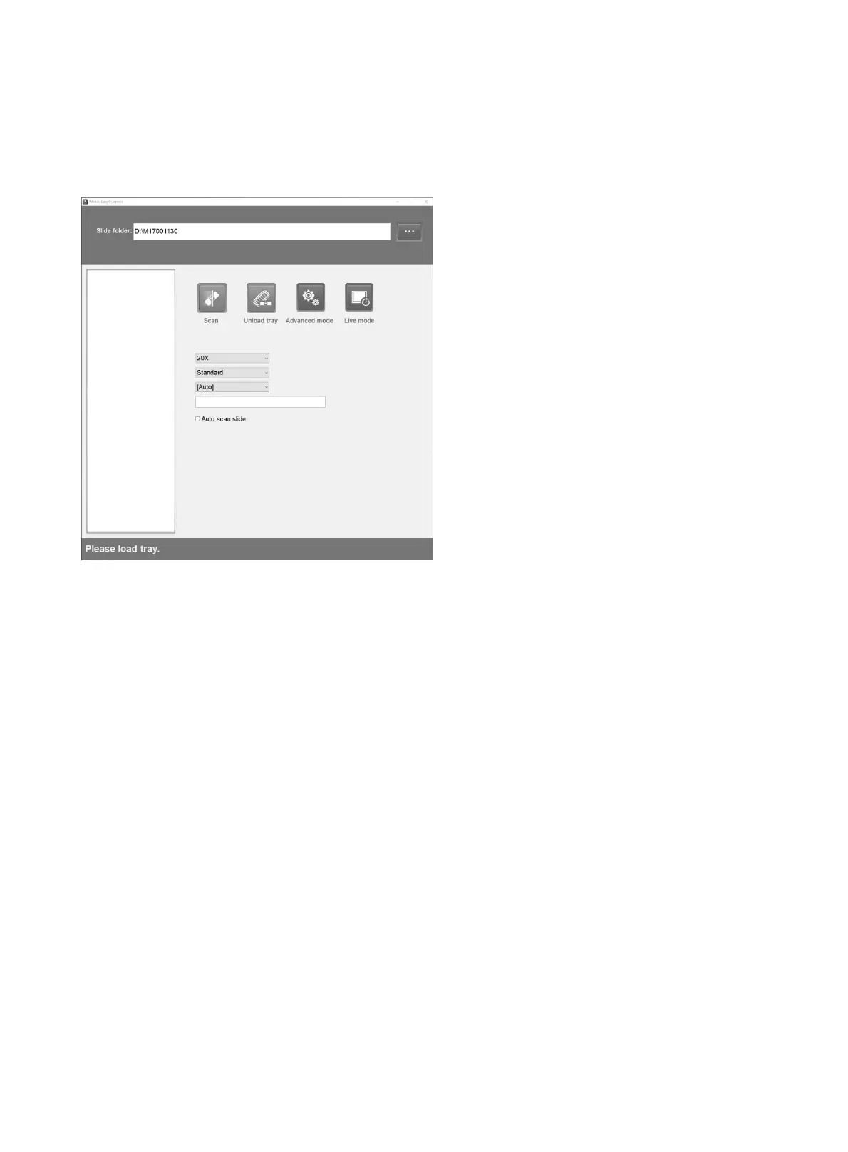 This is simplified operation interface, software initial status “Scan” button is in grey. After the slide tray is